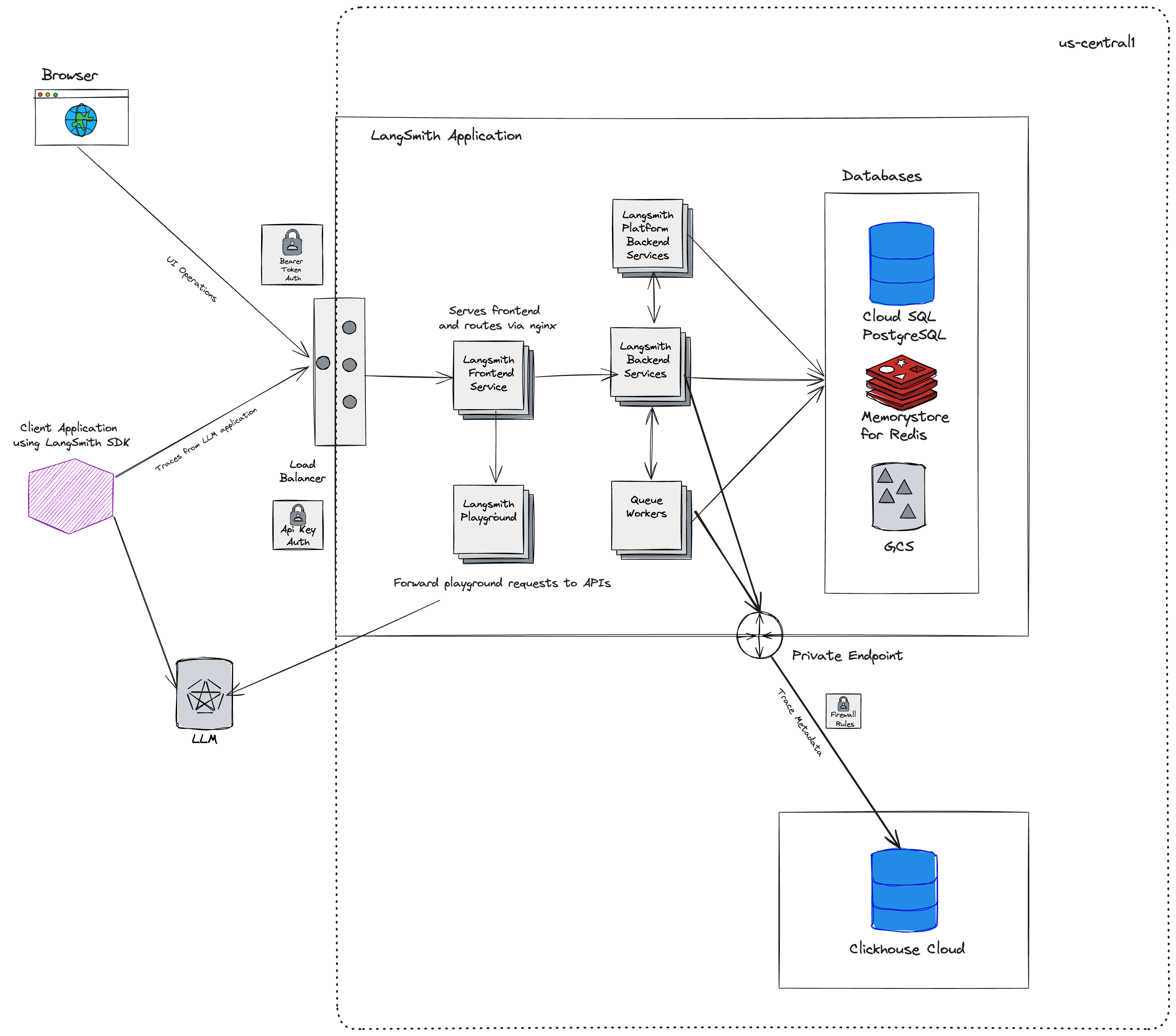 • Google Cloud Load Balancer for routing traffic to the LangSmith services.